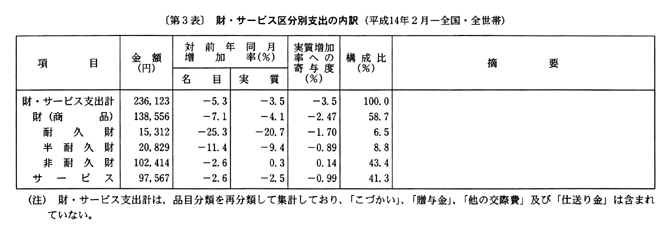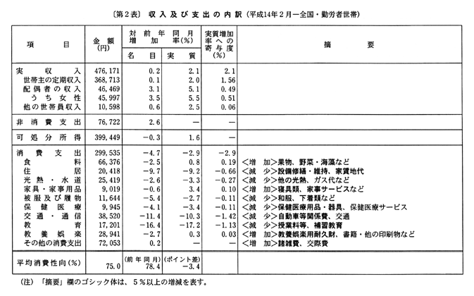 また、消費支出は、平成十三年十二月に実質減少となった後、十四年一月は実質増加となったが、二月は実質減少となった。