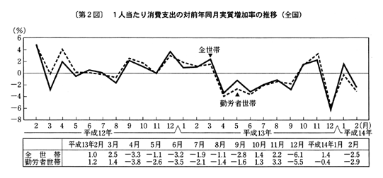 前年同月比でみると、全世帯の一世帯当たりの消費支出は、平成十三年十二月に実質減少となった後、十四年一月は実質増加となったが、二月は実質減少となった。