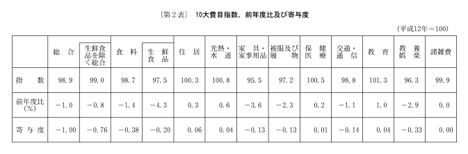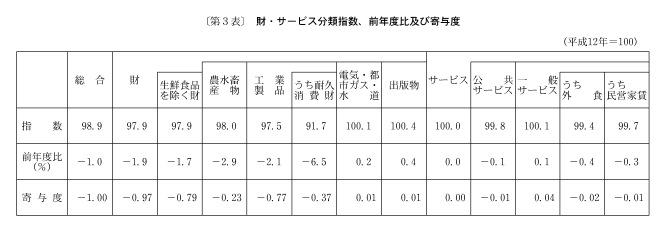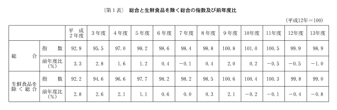 なお、生鮮食品を除く総合指数は、平成十年度以降四年連続して下落している。