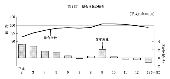 (1)総合指数は平成十二年を一〇〇として九八・九となり、前年度比は一・〇%の下落となった。