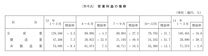 経常利益は、九兆三千八百八十一億円で、前年同期(十兆九千八百六十七億円)を一兆五千九百八十六億円下回り、増加率は△一四・六%(前期△三一・四%)となった。