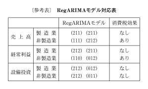 変化点・異常値分析の結果、売上高と経常利益の非製造業については、平成元年一〜三月期、四〜六月期および平成九年一〜三月期を変化時点として消費税効果をモデルに取り入れている。また、曜日効果については取り入れていない。