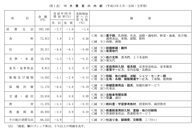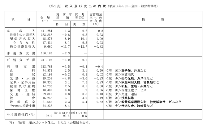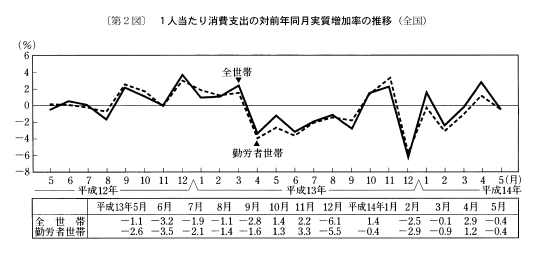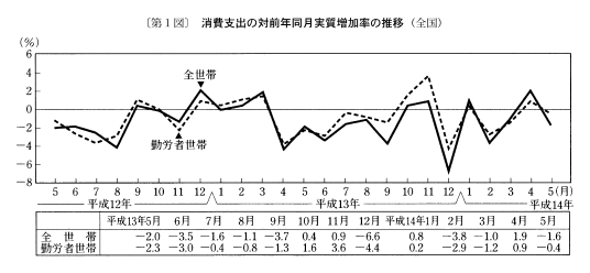 また、消費支出は、平成十四年二月、三月に二か月連続の実質減少となった後、四月は実質増加となったが、五月は実質減少となった。