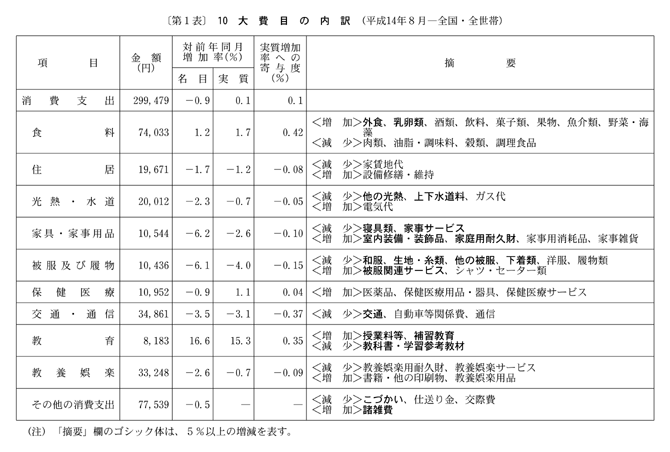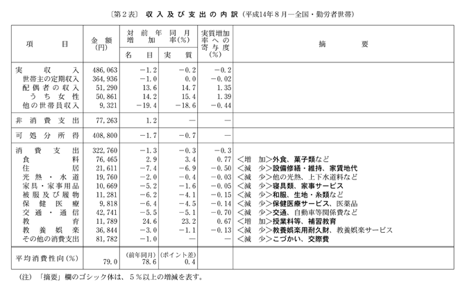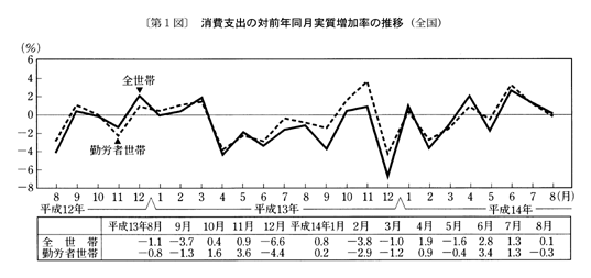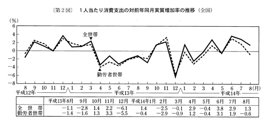 また、消費支出は、平成十四年五月に実質減少となった後、六月、七月は二か月連続の実質増加となったが、八月は実質減少となった。