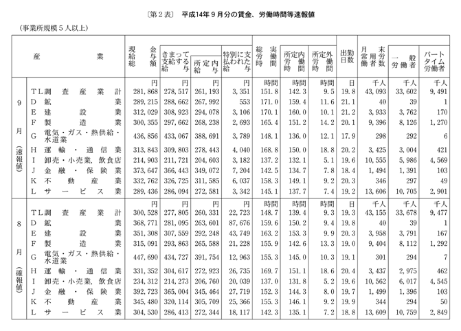 九月の調査産業計の常用労働者一人平均月間現金給与総額は二十八万千八百六十八円、前年同月比一・〇%減であった。現金給与総額のうち、きまって支給する給与は二十七万八千五百十七円、前年同月比〇・八%減であった。これを所定内給与と所定外給与とに分けてみると、所定内給与は二十六万千百九十三円、前年同月比〇・九%減、所定外給与は一万七千三百二十四円、前年同月比は一・五%増であった。
