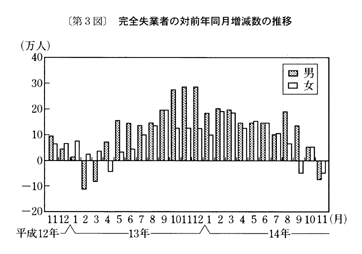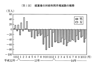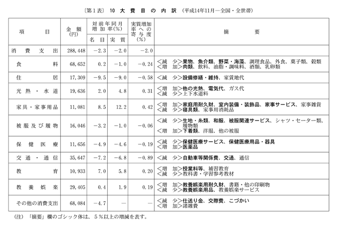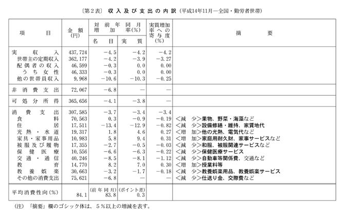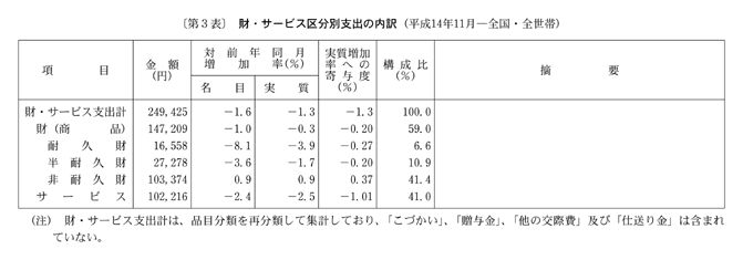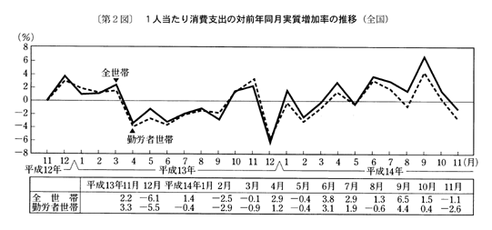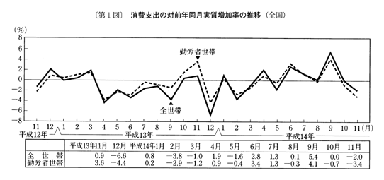 また、消費支出は、平成十四年八月に実質減少となった後、九月は実質増加となったが、十月、十一月は二か月連続の実質減少となった。