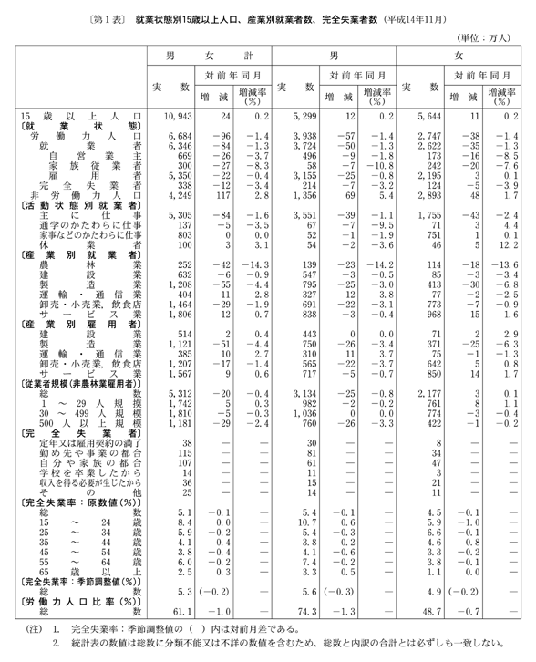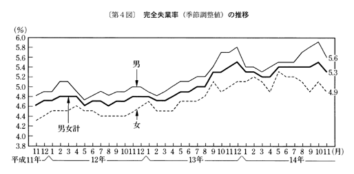 季節調整値でみた完全失業率(労働力人口に占める完全失業者の割合)は五・三%と前月に比べ〇・二ポイントの低下となっている。男女別にみると、男性は五・六%、女性は四・九%と、前月に比べ男性は〇・三ポイントの低下、女性は〇・二ポイントの低下となっている。