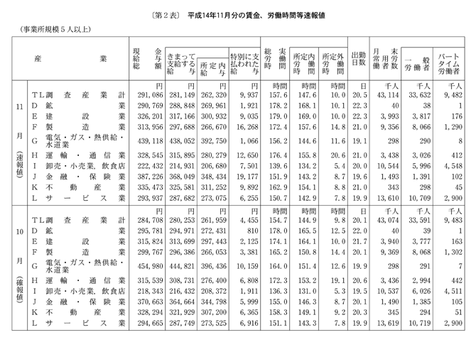 十一月の調査産業計の常用労働者一人平均月間現金給与総額は二十九万千八十六円、前年同月比一・六%減であった。現金給与総額のうち、きまって支給する給与は二十八万千百四十九円、前年同月比〇・六%減であった。これを所定内給与と所定外給与とに分けてみると、所定内給与は二十六万二千三百二十円、前年同月比一・〇%減、所定外給与は一万八千八百二十九円、前年同月比は五・六%増であった。