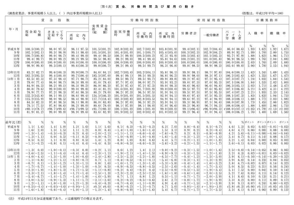 常用労働者全体の雇用の動きを産業別に前年同月比によってみると、前年同月を上回ったものはサービス業一・五%増であった。運輸・通信業は前年同月と同水準であった。前年同月を下回ったものは建設業〇・二%減、卸売・小売業,飲食店及び不動産業〇・五%減、電気・ガス・熱供給・水道業一・三%減、金融・保険業二・三%減、製造業三・九%減、鉱業五・七%減であった。