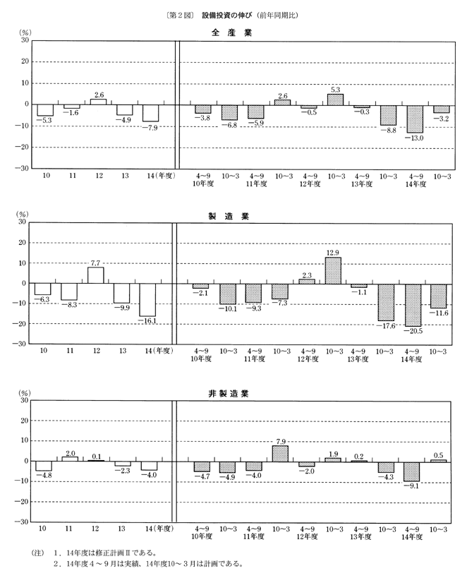 設備投資の動向を半期別に前年同期比でみると、平成十三年度十〜三月期(実績)八・八%減の後、十四年度四〜九月期(実績)は一三・〇%減と引き続き減少した。