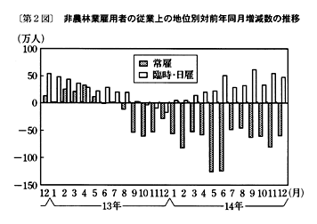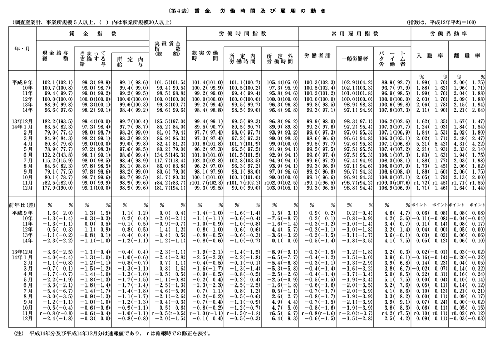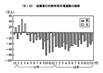 十二月の調査産業計の雇用の動きを前年同月比によってみると、常用労働者全体で〇・六%減、常用労働者のうち一般労働者では一・五%減、パートタイム労働者では二・五%増であった。