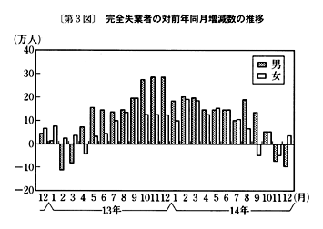 完全失業者数は三百五十九万人となり、前年に比べ十九万人増加し、十一年連続の増加となった。男女別にみると、男性の完全失業者は二百十九万人と前年に比べ十万人増、女性の完全失業者は百四十万人と前年に比べ九万人増となっている(第4図、第5図参照)。