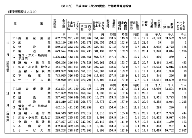 十二月の調査産業計の常用労働者一人平均月間現金給与総額は六十三万二千七百五十九円、前年同月比二・四%減であった。現金給与総額のうち、きまって支給する給与は二十八万千四百九十二円、前年同月比〇・三%減であった。これを所定内給与と所定外給与とに分けてみると、所定内給与は二十六万二千四百七円、前年同月比〇・八%減、所定外給与は一万九千八十五円、前年同月比は六・五%増であった。