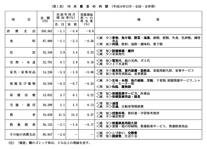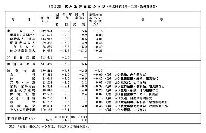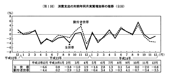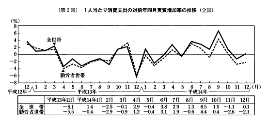 前年同月比でみると、全世帯の一世帯当たりの消費支出は、平成十四年五月に実質減少となった後、六月以降四か月連続の実質増加となり、十月は同水準となったが、十一月、十二月は二か月連続の実質減少となった。