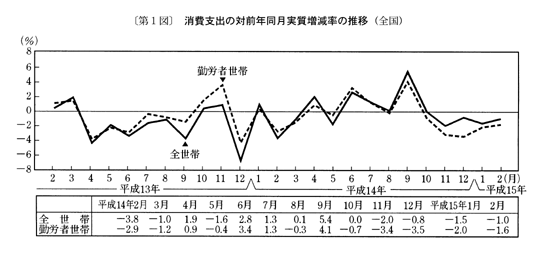 前年同月比でみると、全世帯の一世帯当たりの消費支出は、平成十四年五月に実質減少となった後、六月以降四か月連続の実質増加となり、十月は同水準となったが、十一月以降四か月連続の実質減少となった。