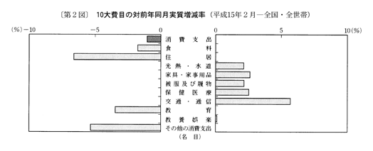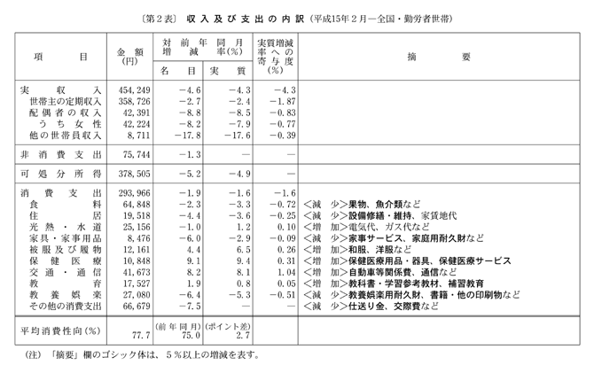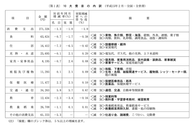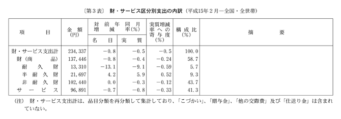 また、消費支出は、平成十四年八月に実質減少となった後、九月は実質増加となったが、十月以降五か月連続の実質減少となった。