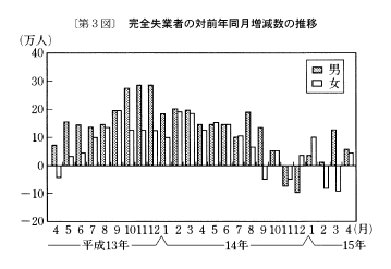 完全失業者数は三百八十五万人と、前年同月に比べ十万人(二・七%)増となり、二か月連続の増加となっている。男女別にみると、男性は二百三十三万人、女性は百五十一万人で、前年同月に比べ、男性は六万人(二・六%)の増加、女性は四万人(二・七%)の増加となっている。