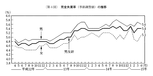 季節調整値でみた完全失業率(労働力人口に占める完全失業者の割合)は五・四%と前月と同率となっている。男女別にみると、男性は五・六%、女性は五・一%と、前月に比べ男性は〇・一ポイントの低下、女性は〇・三ポイントの上昇となっている。