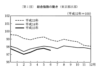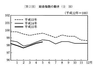 (1) 総合指数は平成十二年を一〇〇として九八・五となり、前月比は〇・二%の上昇。前年同月比は〇・二%の下落となった。