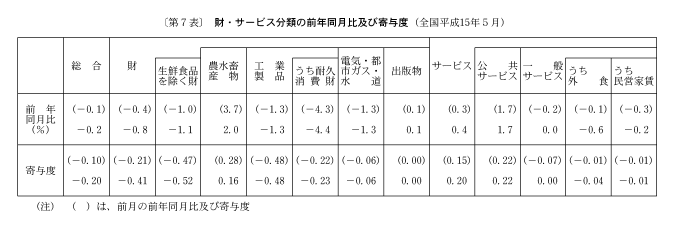 総合指数の前年同月比が〇・四%の下落となった内訳を寄与度でみると、教養娯楽、住居、食料、家具・家事用品などの下落が要因となっている。