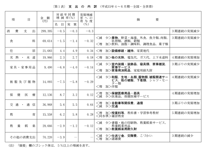 前年同期比でみると、全世帯の消費支出は、平成十四年四〜六月期、七〜九月期に二期連続の実質増加となった後、十〜十二月期以降三期連続の実質減少となった。