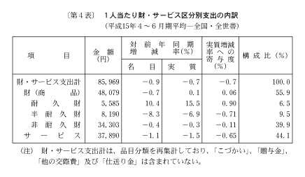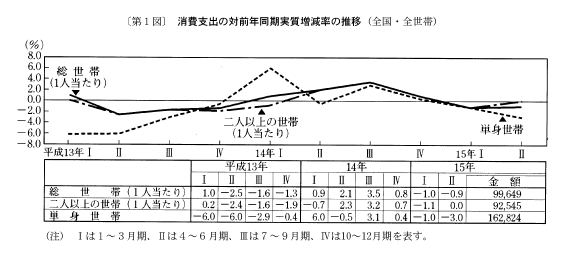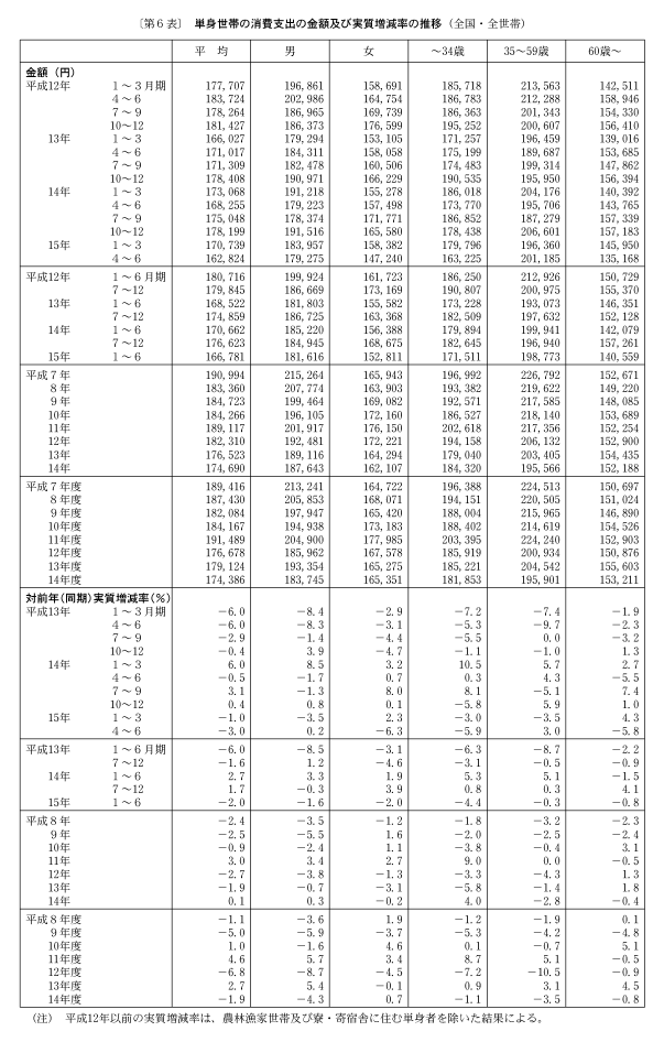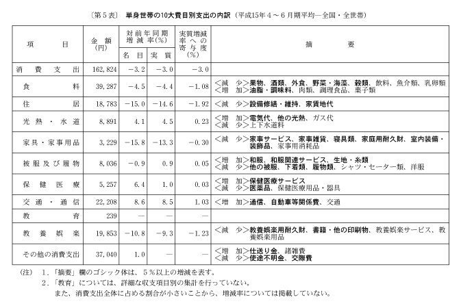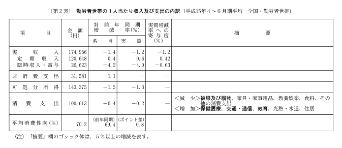 ▽家計調査報告(総世帯・単身世帯)―平成十五年四〜六月期平均速報―………総 務 省