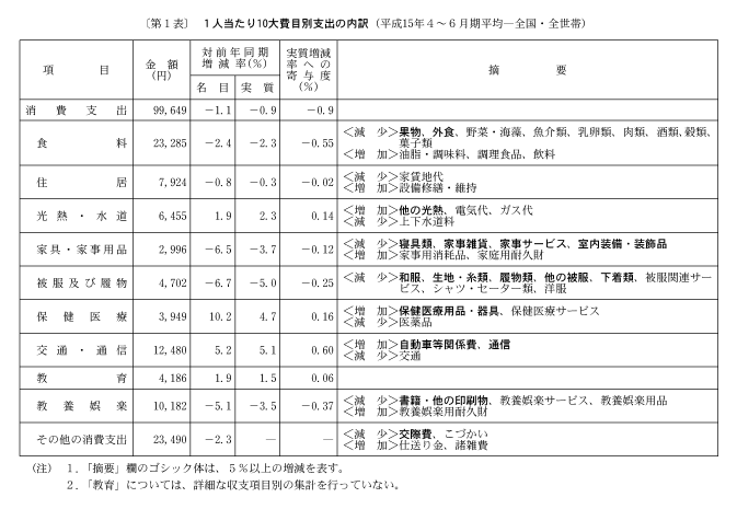 実質減少の要因は、食料(二・三%減)、教養娯楽(三・五%減)など。