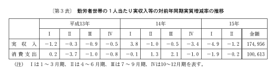 また、消費支出は、十万六百十三円となり、前年同期比でみると、名目〇・四%の減少、実質は〇・二%の減少と、三期連続の実質減少となった。