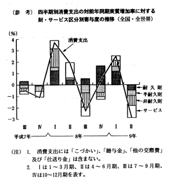 消費支出は、平成九年一月以降三か月連続の実質増加となったが、四月以降三か月連続の実質減少(第1図、第2表参照)