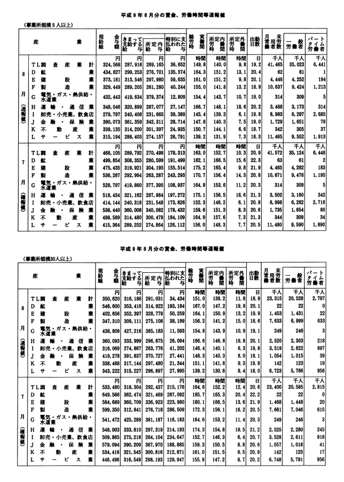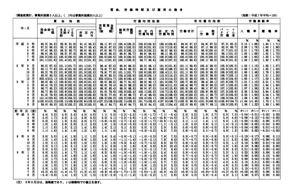 賃金の動向を毎月勤労統計でみると、現金給与総額は、事業所規模五人以上では前年同月比で八月一・〇%増の後、九月(速報)は一・一%増(事業所規模三十人以上では同一・四%増)となり、うち所定外給与は、九月(速報)は同一・九%増(事業所規模三十人以上では同二・九%増)となった。実質賃金は、前年同月比で八月一・一%減の後、九月(速報)は一・三%減(事業所規模三十人以上では同一・〇%減)となった。なお、平成九年夏季賞与は、事業所規模五人以上では前年比一・五%増(前年は同一・八%増)となった。