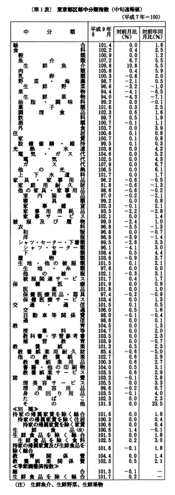 東京都区部の動きでみると、生鮮食品を除く総合は、前年同月比で九月二・三%の上昇の後、十月(中旬速報値)は一般食料工業製品の上昇幅の縮小等により二・二%の上昇(前月比保合い)となった。なお、総合は、前年同月比で九月二・二%の上昇の後、十月(中旬速報値)は二・三%の上昇(前月比〇・二%の上昇)となった。