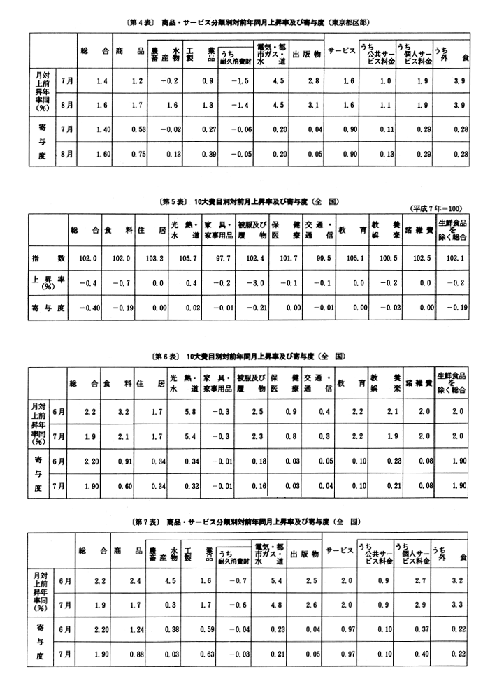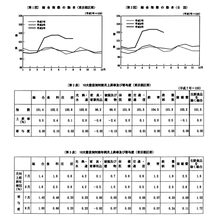 全国の生鮮食品を除く総合は、前年同月比で八月二・一%の上昇の後、九月は公共料金(広義)の上昇幅の拡大等により二・四%の上昇(前月比〇・八%の上昇)となった。なお、総合は、前年同月比で八月二・一%の上昇の後、九月は二・四%の上昇(前月比〇・七%の上昇)となった。