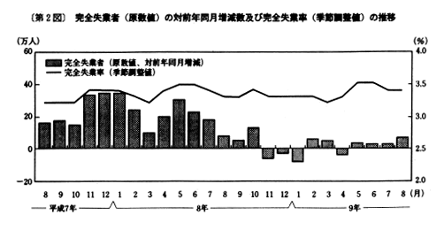 労働力需給をみると、有効求人倍率(季節調整値)は、八月〇・七二倍の後、九月〇・七一倍となった。新規求人倍率(季節調整値)は、八月一・二〇倍の後、九月一・一七倍となった。雇用者数は、伸びが鈍化している。総務庁「労働力調査」による雇用者数は、九月は前年同月比〇・七%増(前年同月差三十六万人増)となった。常用雇用(事業所規模五人以上)は、八月前年同月比〇・九%増(季節調整済前月比〇・〇%)の後、九月(速報)は同〇・九%増(同〇・一%増)となり(事業所規模三十人以上では前年同月比〇・一%増)、産業別には製造業では同〇・四%減となった。九月の完全失業者数(季節調整値)は、前月差四万人増の二百三十三万人、完全失業率(同)は、八月三・四%の後、九月三・四%となった。所定外労働時間(製造業)は、事業所規模五人以上では八月前年同月比五・五%増(季節調整済前月比〇・五%減)の後、九月(速報)は同二・九%増(同一・五%減)となっている(事業所規模三十人以上では前年同月比四・〇%増)。