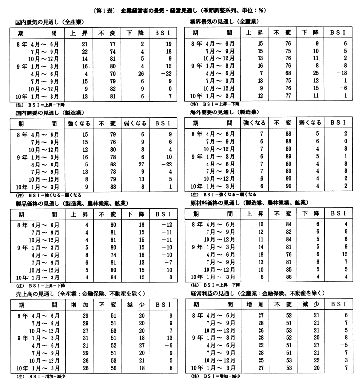 また、原材料在庫水準の判断指標(BSI:「過大」−「不足」)は、九年六月末、九月末ともに「九」と横ばいとなっている。
