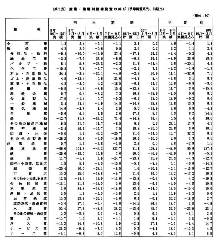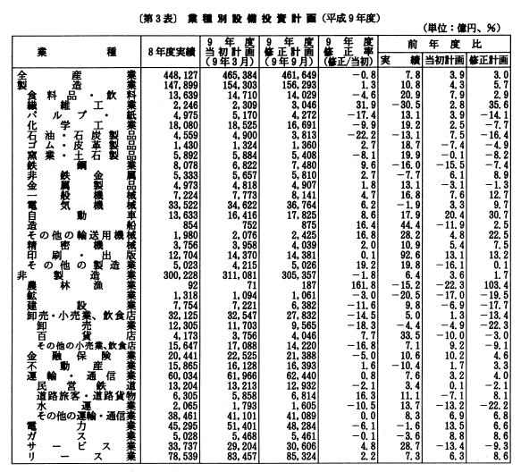 一方、非製造業をみると、農林漁業は一〇三・四%の増加、ガスは八・六%の増加、リースは八・六%の増加、電力は六・六%の増加、金融保険は四・六%の増加、運輸・通信は四・〇%の増加、不動産は三・三%の増加が見込まれている反面、鉱業は一九・五%の減少、建設は一七・七%の減少、卸・小売は一三・四%の減少、サービスは九・三%の減少が見込まれている。