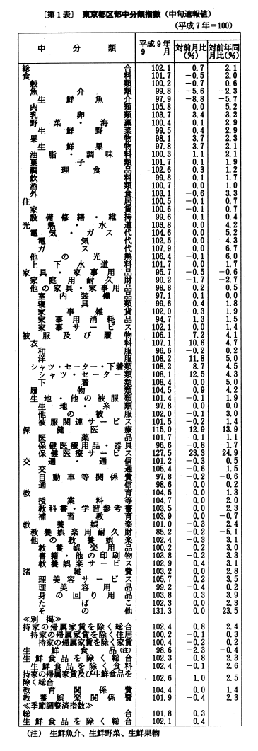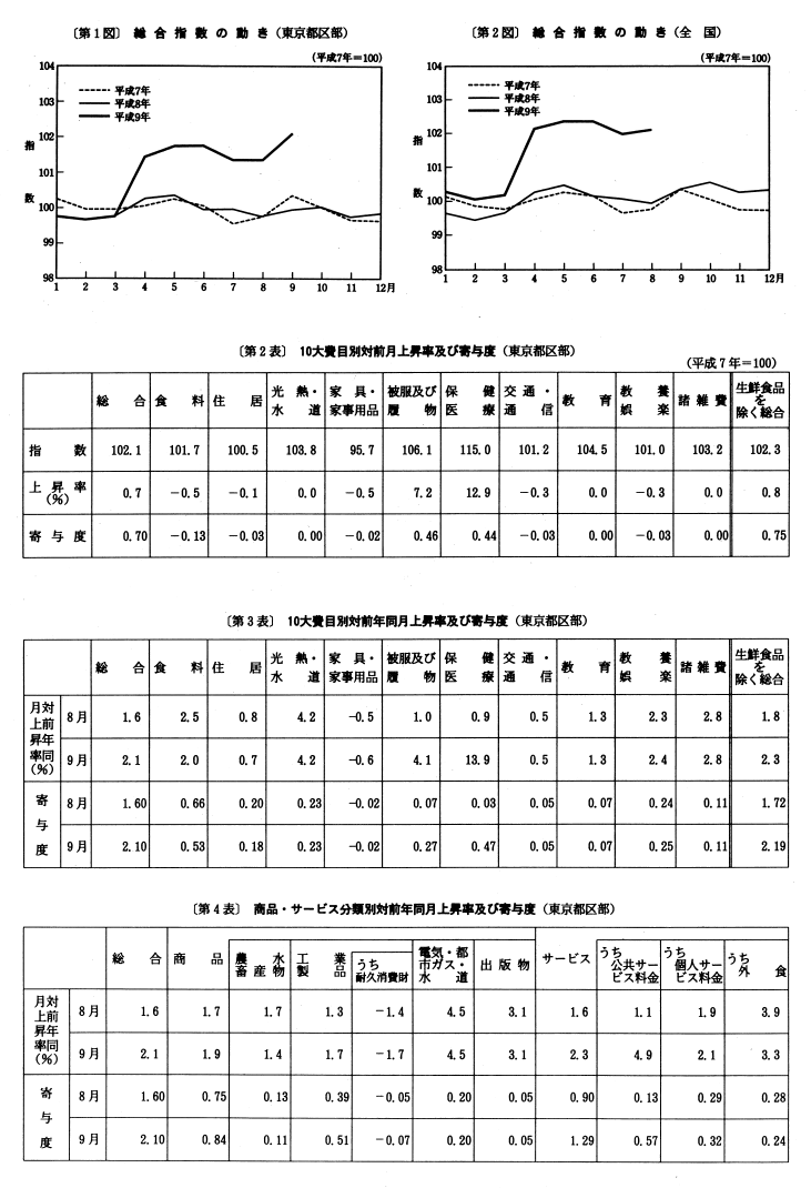 (1) 総合指数は平成七年を一〇〇として一〇二・一となり、前月比は〇・七%の上昇。前年同月比は六月一・八%の上昇、七月一・四%の上昇、八月一・六%の上昇と推移した後、九月は二・一%の上昇となり、上昇幅は前月に比べ〇・五ポイント拡大。これは、保健医療サービスの上昇幅が拡大したことなどによるもの。