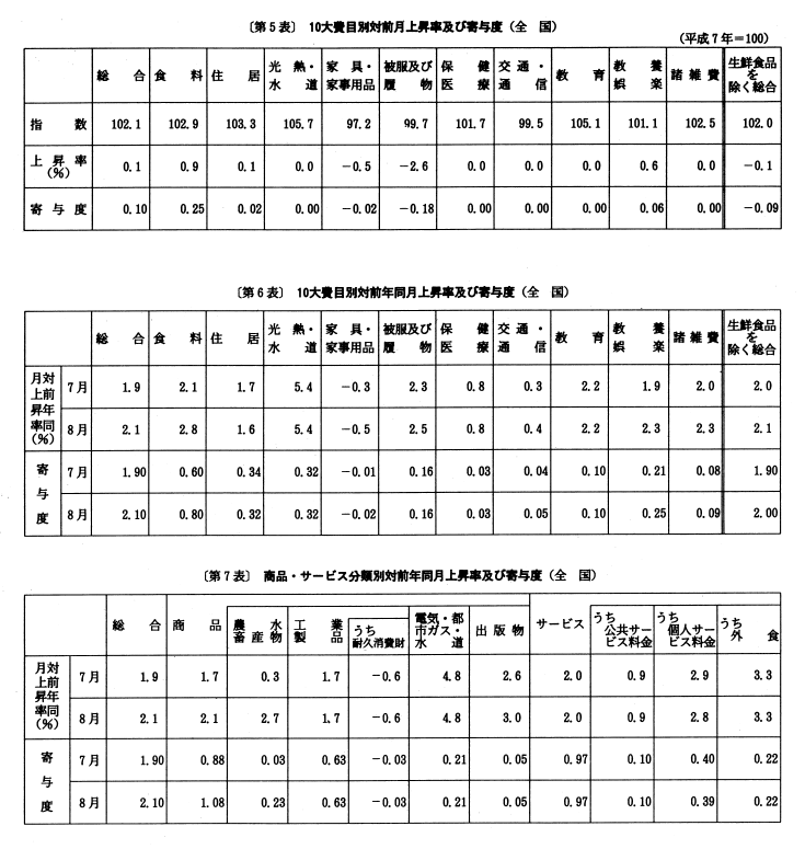 (1) 総合指数は平成七年を一〇〇として一〇二・一となり、前月比は〇・一%の上昇。前年同月比は五月一・九%の上昇、六月二・二%の上昇、七月一・九%の上昇と推移した後、八月は二・一%の上昇となった。