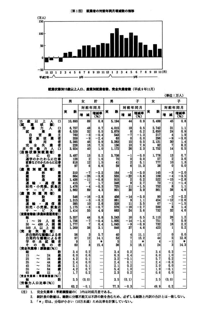 賃金の動向を毎月勤労統計でみると、現金給与総額は、事業所規模五人以上では前年同月比で十月一・四%増の後、十一月(速報)は一・〇%減(事業所規模三十人以上では同一・二%減)となり、うち所定外給与は、十一月(速報)は同〇・〇%(事業所規模三十人以上では同〇・六%増)となった。実質賃金は、前年同月比で十月一・三%減の後、十一月(速報)は三・一%減(事業所規模三十人以上では同三・四%減)となった。なお、平成九年の民間主要企業の年末一時金妥結額(労働省調べ)は前年比二・八%増(前年は同二・八%増)となった。