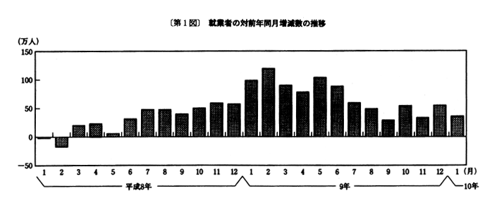 対前年同月増減をみると、「卸売・小売業、飲食店」及びサービス業は前月(それぞれ十万人増、五十一万人増)に比べ増加幅が拡大している。一方、建設業及び製造業は前月(それぞれ十五万人減、五万人減)に比べ減少幅が拡大している。また、運輸・通信業は六か月ぶりの減少となっている。