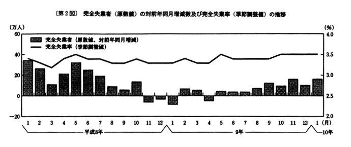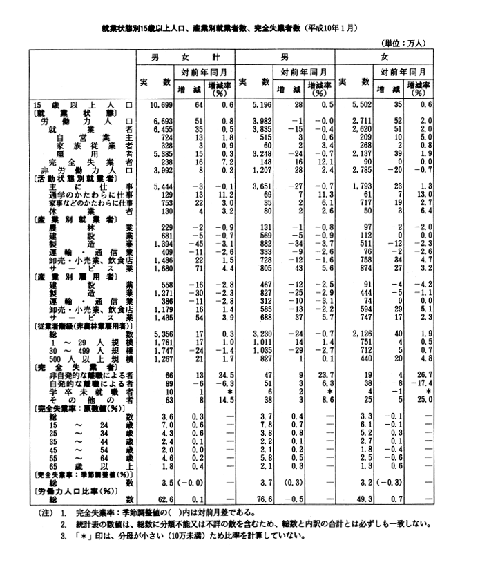 季節調整値でみた完全失業率は前月と同率の三・五%で、比較可能な昭和二十八年以降で最も高い水準が続いている。男女別にみると、男子は三・七%、女子は三・二%で、前月に比べ男子は〇・三ポイントの上昇、女子は〇・三ポイントの低下となっている。