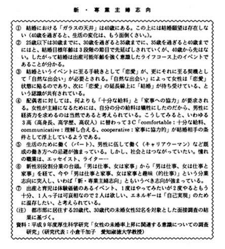 このように、団塊の世代に続く昭和三十年代生まれの女性たちにとって、郊外専業主婦生活は、それだけでは「夢」ではあり得なくなった。生活のために結婚しなければならないという制約から解放され、「付加価値のある結婚生活」をさせてくれる相手をじっくり選ぶことが可能となったことが、晩婚化につながっていったと考えられる。