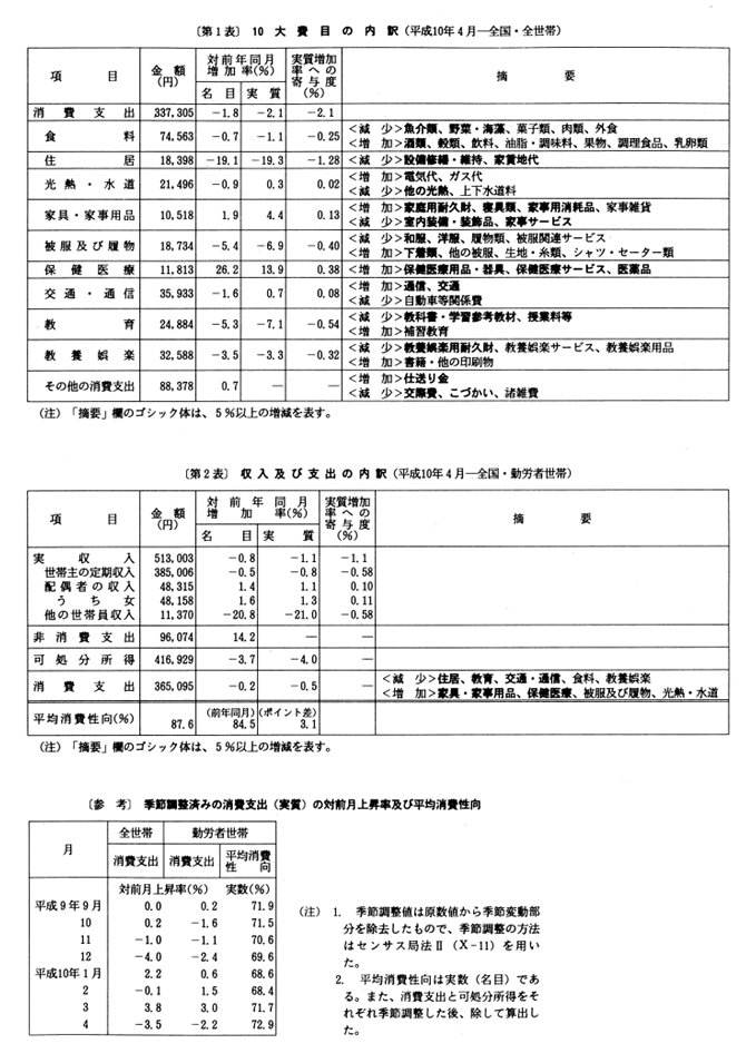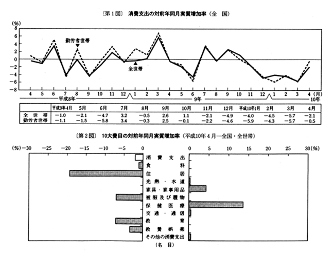 全世帯の消費支出は、平成九年四月以降三か月連続の実質減少となった後、七月は実質増加、八月は実質減少、九月、十月は実質増加となり、十一月以降六か月連続の実質減少となった。