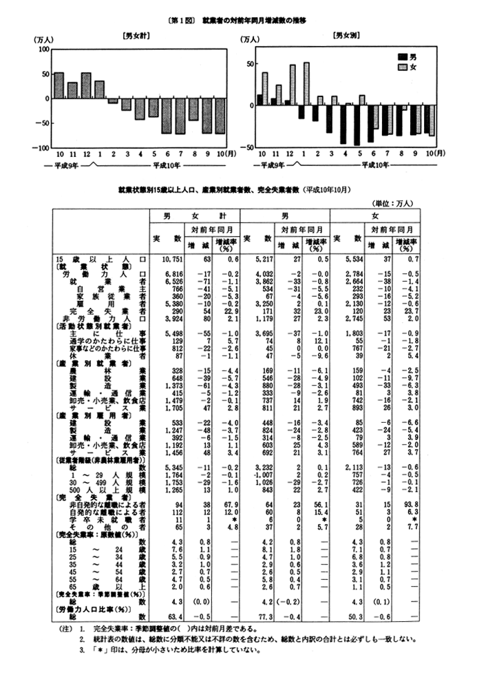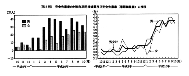 季節調整値でみた完全失業率は前月と同率の四・三%で、比較可能な昭和二十八年以降で最高となっている。男女別にみると、男性は四・二%で、前月に比べ〇・二ポイントの低下、女性は四・三%で、前月に比べ〇・一ポイントの上昇となっている。