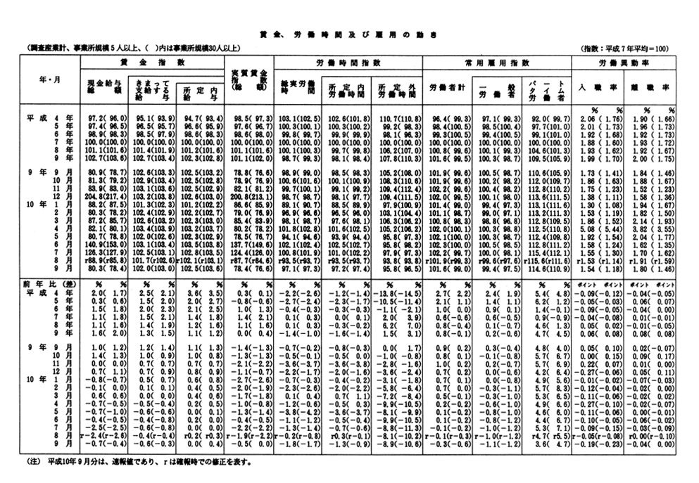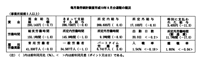 九月の規模五人以上事業所の調査産業計の雇用の動きを前年同月比によってみると、常用労働者全体で〇・三%減、常用労働者のうち一般労働者では一・一%減、パートタイム労働者では三・六%増であった。常用労働者全体の季節調整値は前月比〇・〇%と前月と同水準であった。