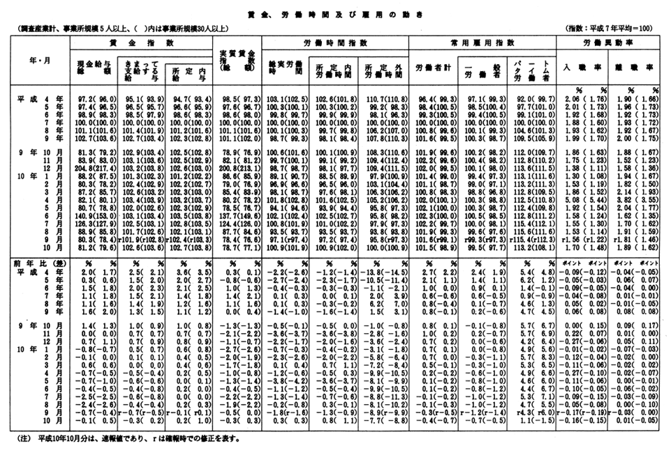 十月の規模五人以上事業所の調査産業計の雇用の動きを前年同月比によってみると、常用労働者全体で〇・四%減、常用労働者のうち一般労働者では〇・七%減、パートタイム労働者では一・一%増であった。常用労働者全体の季節調整値は前月比〇・一%減となった。