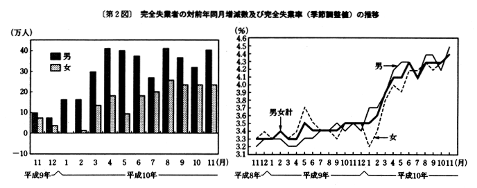 季節調整値でみた完全失業率は四・四%で、前月に比べ〇・一ポイント上昇し、比較可能な昭和二十八年以降で最高となっている。男女別にみると、男性は四・五%で、前月に比べ〇・三ポイントの上昇、女性は四・四%で、前月に比べ〇・一ポイント上昇し、男女ともに昭和二十八年以降で最高となっている。