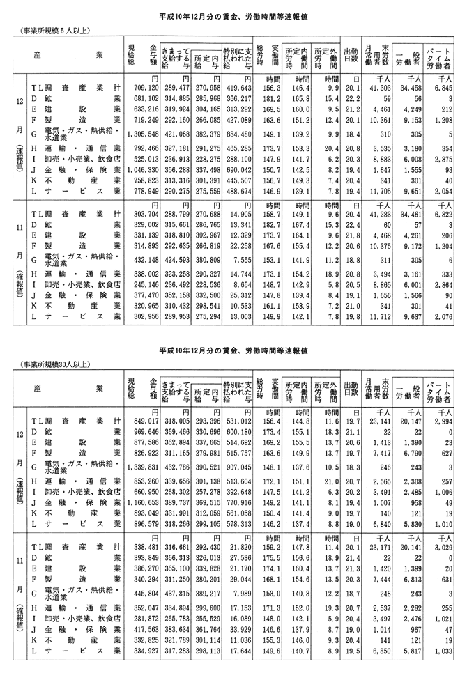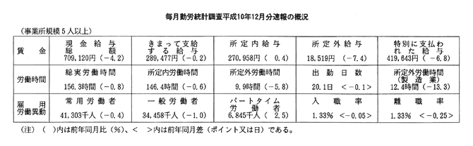 十二月の調査産業計の常用労働者一人平均月間現金給与総額は七十万九千百二十円、前年同月比は四・二%減であった。現金給与総額のうち、きまって支給する給与は二十八万九千四百七十七円、前年同月比〇・二%減であった。
