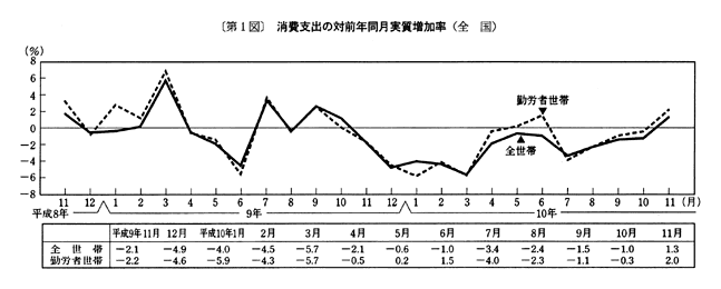 全世帯の消費支出は、平成九年十一月以降十二か月連続の実質減少となった後、十年十一月は十三か月ぶりに実質増加となった。