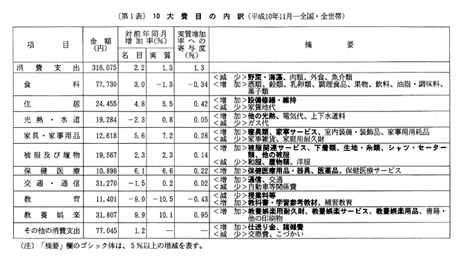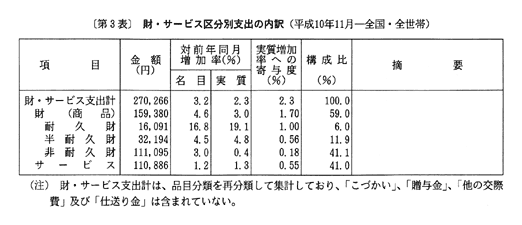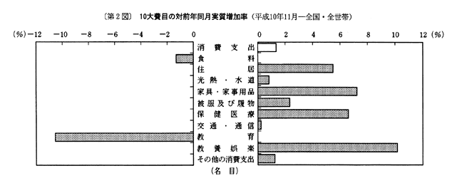 消費支出は、平成九年十月以降七か月連続の実質減少となり、十年五月、六月は実質増加となった後、七月以降四か月連続の実質減少となったが、十一月は実質増加となった。