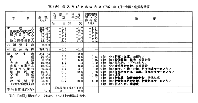 勤労者世帯の実収入は、平成九年十一月以降六か月連続の実質減少となった後、十年五月は実質増加、六月、七月は実質減少、八月は実質増加、九月は実質減少、十月は実質増加となり、十一月は実質減少となった。